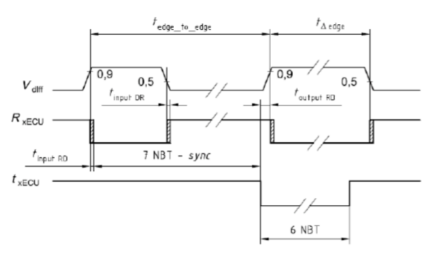 內部延時tnode測量應當在通過在空閒狀態,錯誤有效的CAN節點的CAN總線輸入一個發送位。CAN節點應當認為這個發送位為幀的起始位並執行硬件二次同步。CAN控制器應當在發送位後的第六個接收位檢測到填充錯誤,並且作為有效的錯誤標誌響應。外部發送發送位到錯誤標誌開始之間的時間為tedge o to o edgeo o 。