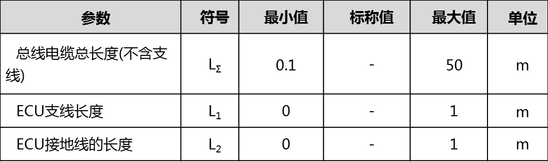 LS-CAN網段拓撲結構採用總線型拓撲結構,如圖3所示,具體數值見表1。通信速率是125 k~500kbit/s,除此之外,還需要滿足下列技術要求: